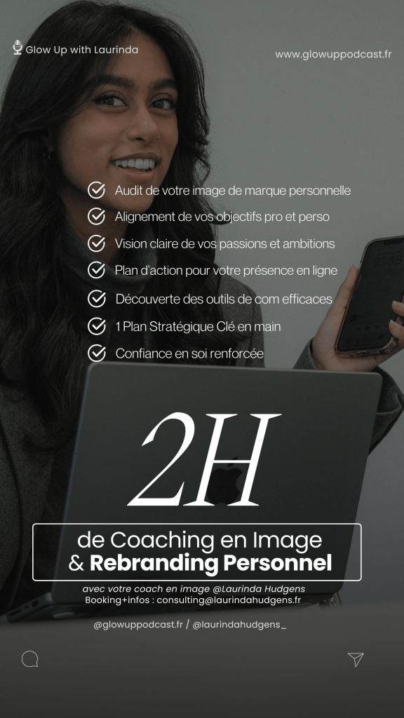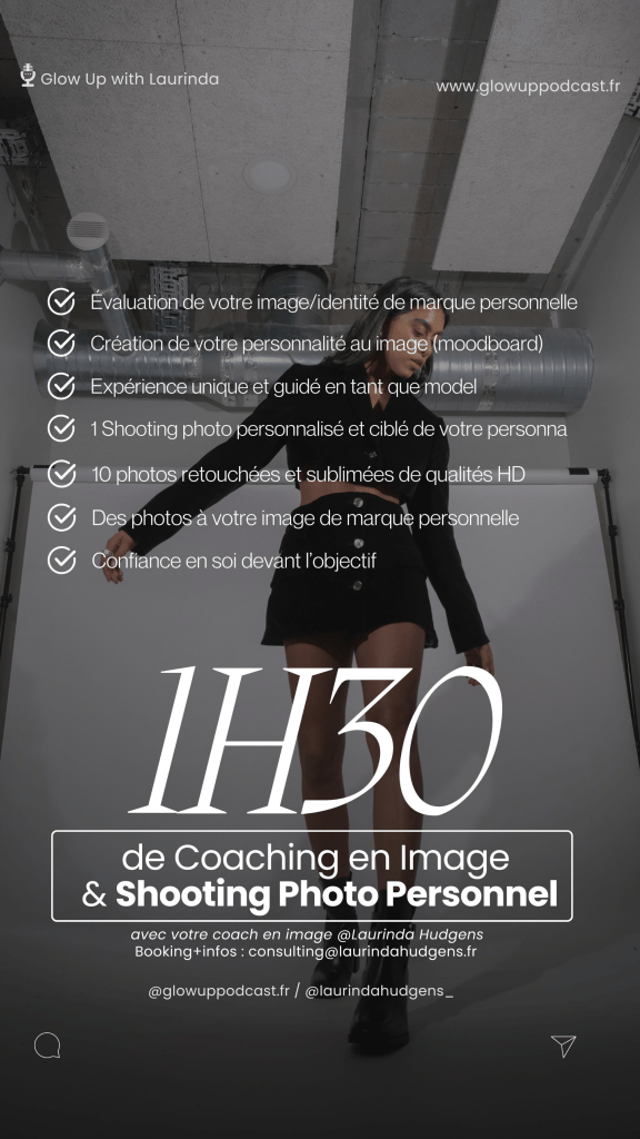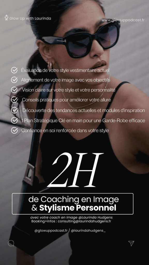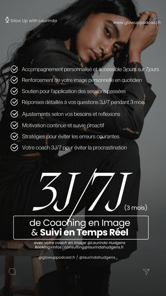 Tu peux choisir le Pack Intensive pour un Glow Up rapide, intense et efficace sur 6 mois. Tu peux réfléchir ou me poser tes questions si besoin. En attendant, je te conseilles d’écouter mes épisodes de podcast dédié à l’épanouissement personnel et la revalorisation de soi ! Tu peux aussi commencer par une session de Coaching en Image de 2h en Rebranding Personnel et/ou Stylisme Personnel , maintenant à toi de jouer !