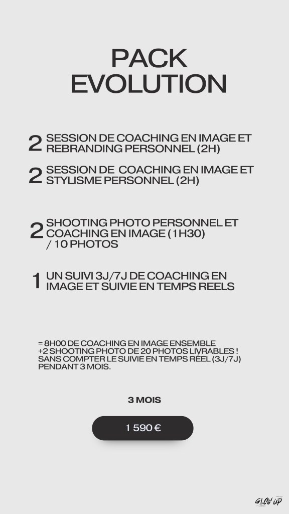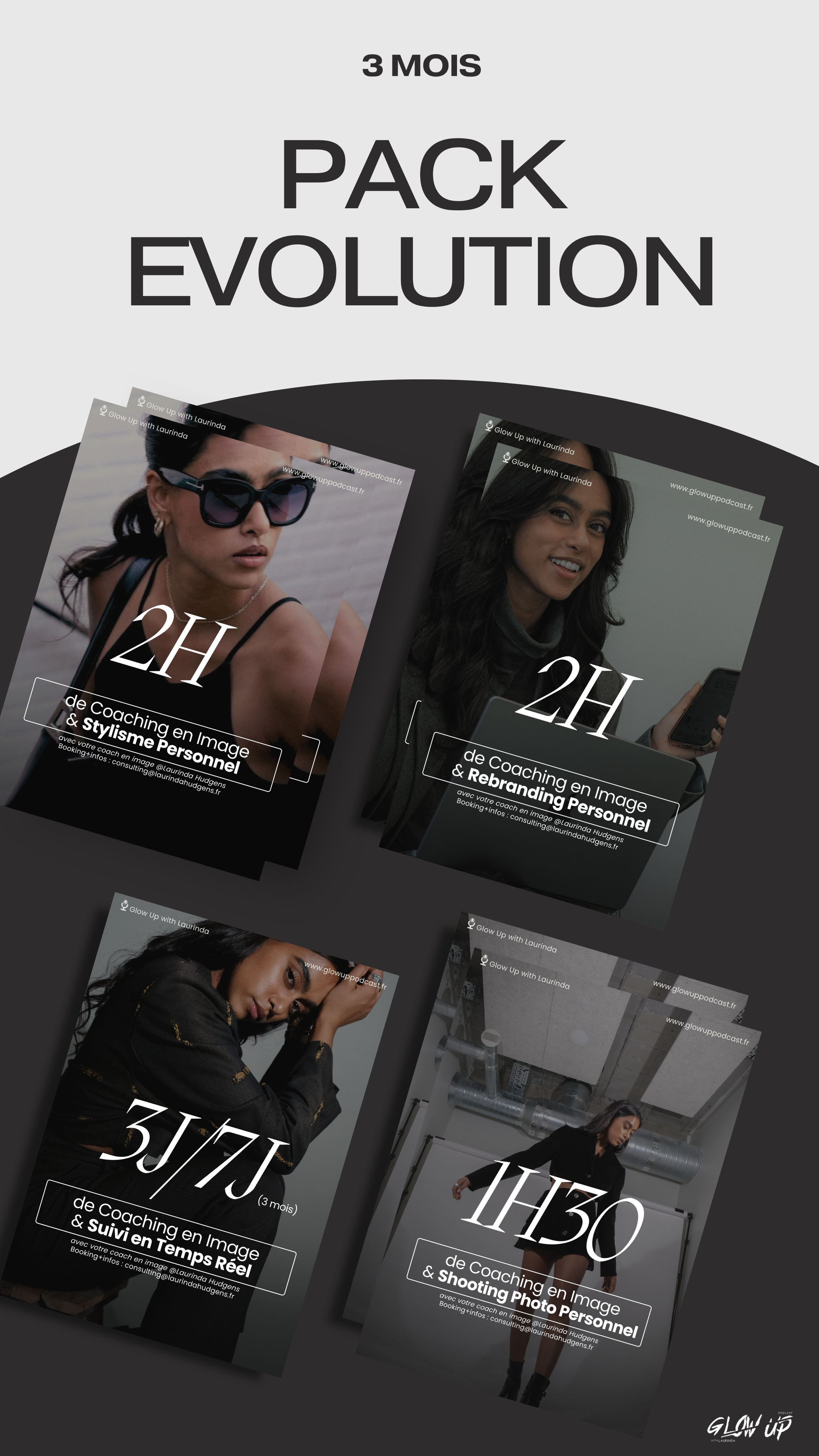 Ce Pack Évolution t’es destiné si tu as l’envie de Glow-Up rapidement à un rythme doux tout en profondeur et d’avoir des bases solides sur chacune de tes facettes, autant sur la partie du Rebranding Personnel que sur le Stylisme Personnel et ton style vestimentaire et son allure. Pour moi lorsque tu veux atteindre un certain niveau, il faut que tout s’aligne dans ton image. Il est important d’avoir une réel cohérence dans ton image de marque autant sur ton image sur le secteur digital, que Entrepreunarial, que personnellement dans ton style vestimentaire. Pour moi, c’est d’une importance crucial pour incarner la personne que tu es et faire une différence.