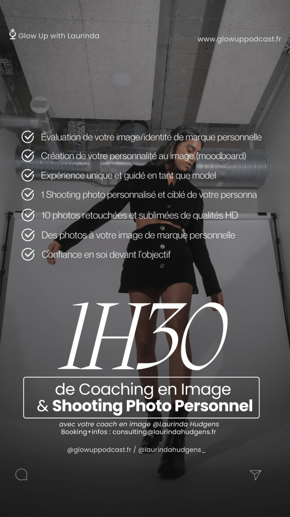 Tu peux choisir le Pack Intensive de 6 mois ou le Pack Évolution de 3 mois pour un Glow Up rapide et efficace. Tu peux réfléchir ou me poser tes questions si besoin. En attendant, je te conseilles d’écouter mes épisodes de podcast en parallèle dédié à l’épanouissement personnel et la revalorisation de soi et de son image ! Tu peux aussi commencer par une session de Coaching en Image de 2h en Rebranding Personnel et/ou Stylisme Personnel , maintenant à toi de jouer !