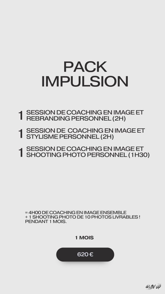 Ce Pack Impulsion t’es destiné si tu as l’envie de Glow-Up et d’avoir les base sur chacune de tes facettes, autant sur la partie du Rebranding Personnel que sur le Stylisme Personnel et ton style vestimentaire et son allure. Pour moi lorsque tu veux atteindre un certain niveau, il faut que tout s’aligne dans ton image. Il est important d’avoir une réel cohérence dans ton image de marque autant sur ton image sur le secteur digital, que Entrepreunarial, que personnellement dans ton style vestimentaire. Pour moi, c’est d’une importance crucial pour incarner la personne que tu es et faire une différence.