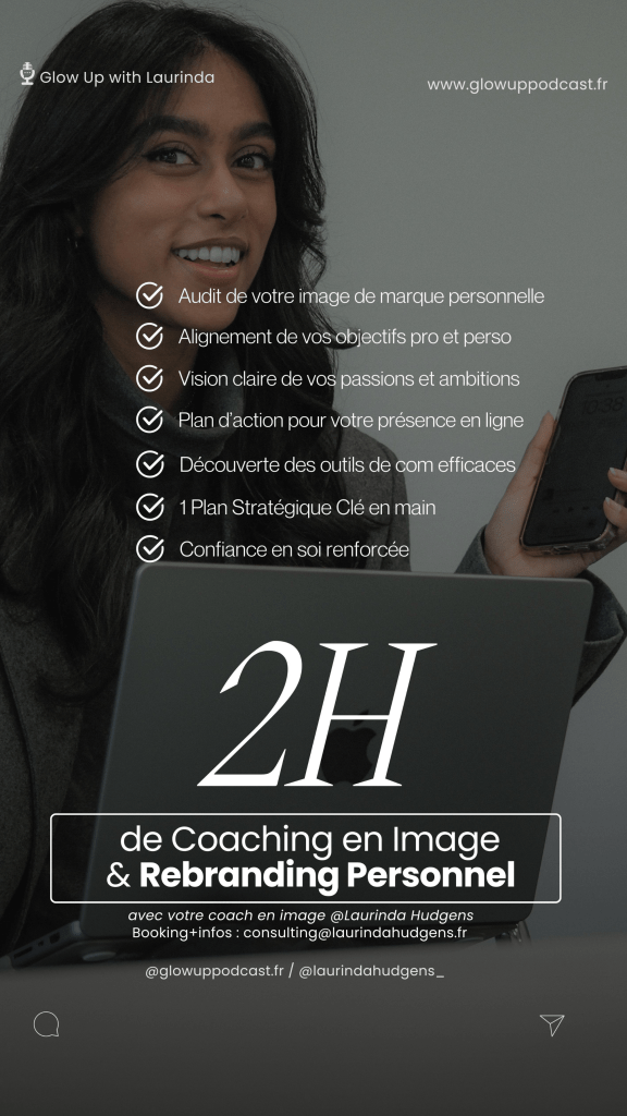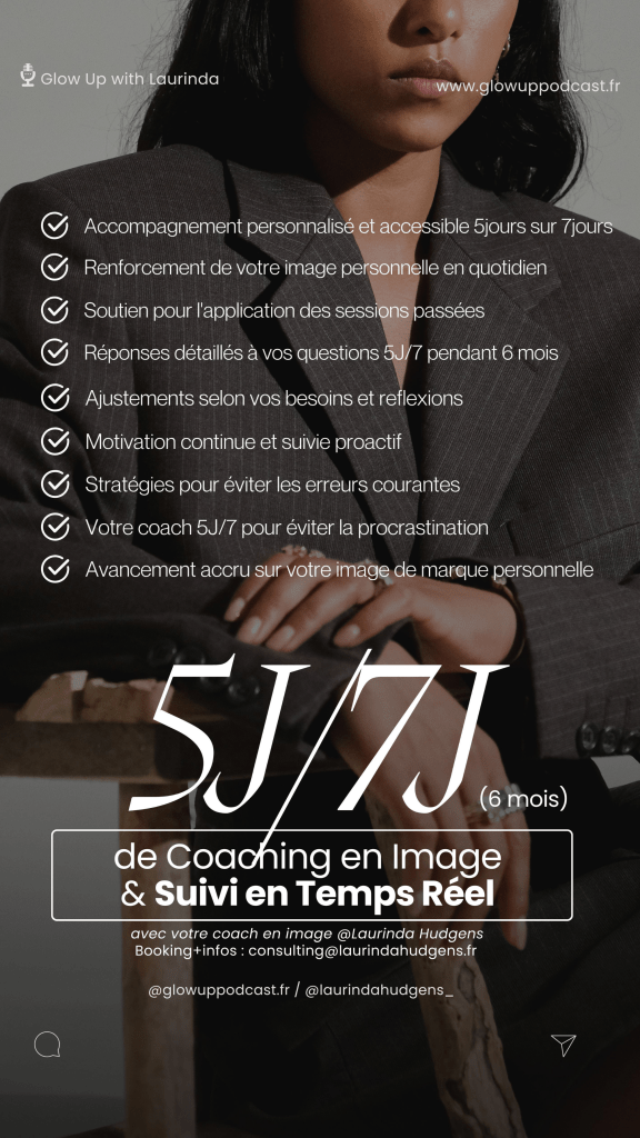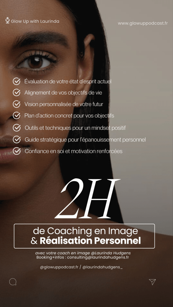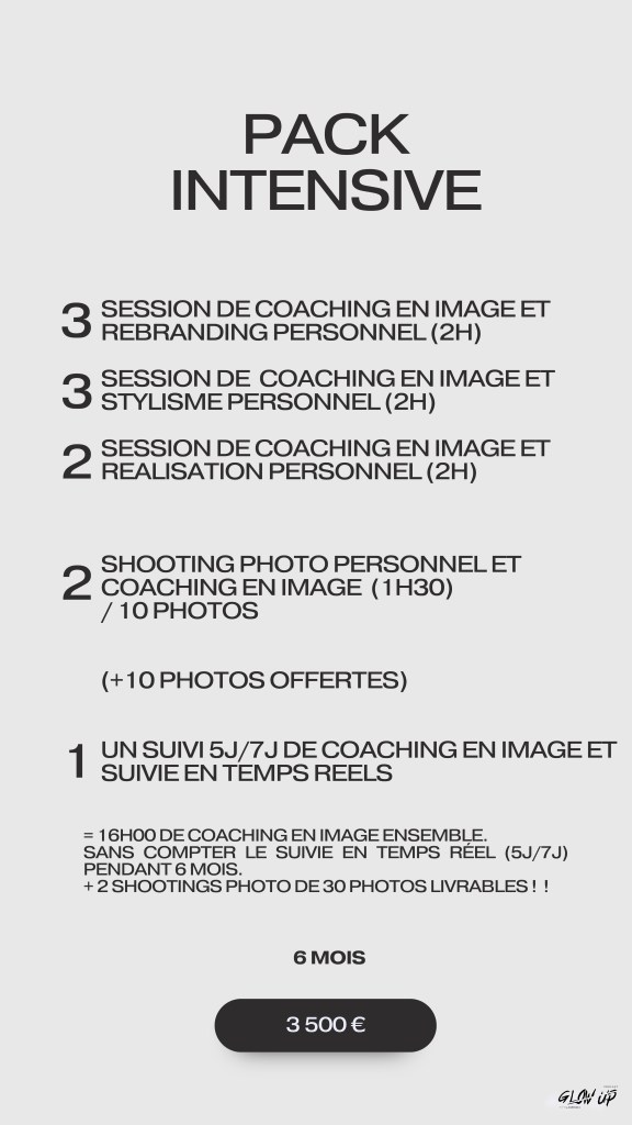 Tu peux choisir ce Pack Intensive pour un Glow Up rapide, intense et efficace sur 6 mois. Tu peux réfléchir ou me poser tes questions si besoin. En attendant, je te conseilles d’écouter mes épisodes de podcast en parallèle dédié à l’épanouissement personnel et la revalorisation de soi et de son image ! Tu peux aussi commencer par une session de Coaching en Image de 2h en Rebranding Personnel et/ou Stylisme Personnel , maintenant à toi de jouer !