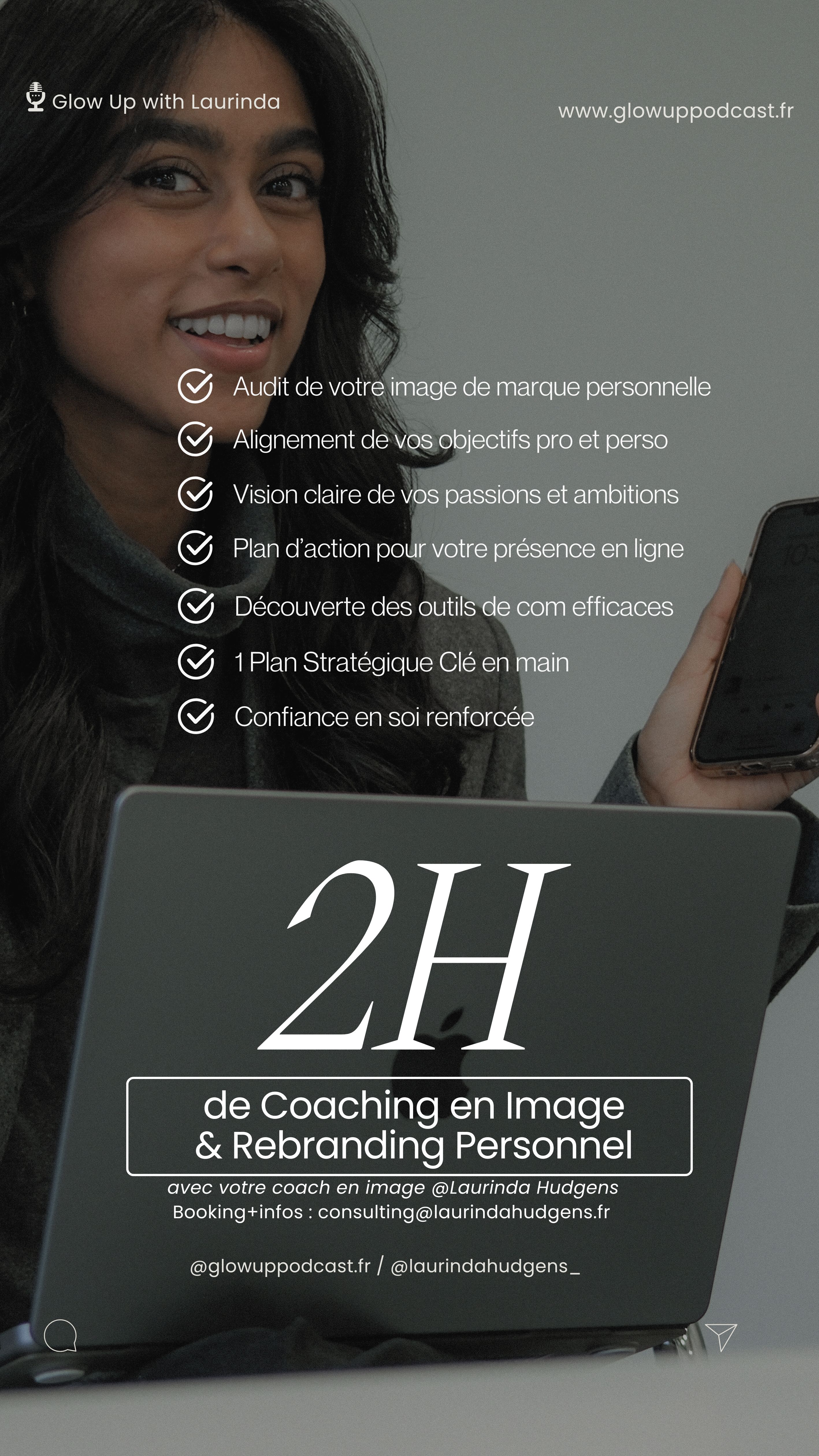 Tu peux poser toutes tes questions au ChatBot ici : https://tr.ee/62wnH8JaLC , sinon tu peux m’écrire en direct par mail à consulting@laurindahudgens.fr